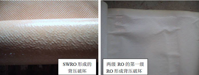 反滲透產(chǎn)水背壓是指反滲透產(chǎn)水靜態(tài)壓力大于給水或濃水靜態(tài)壓力,背壓損壞是反滲透膜元件使用中常見的故障之一,產(chǎn)水背壓會(huì)會(huì)導(dǎo)致產(chǎn)水從膜的產(chǎn)水側(cè)壓入進(jìn)水側(cè),從而導(dǎo)致反滲透膜進(jìn)水側(cè)、最外側(cè)和濃水側(cè)這三處粘接密封線附近破裂,進(jìn)水網(wǎng)格的小格內(nèi)出現(xiàn)氣泡狀剝離。在反滲透膜表面上的破壞形態(tài)看起來像鼓泡,沿著進(jìn)水隔網(wǎng)有規(guī)律地分布,鼓泡的部位其微觀結(jié)構(gòu)已經(jīng)破壞,孔徑變大,透鹽增加,導(dǎo)致反滲透系統(tǒng)脫鹽率下降。對(duì)膠線破壞后會(huì)導(dǎo)致給水側(cè)/濃水側(cè)高電導(dǎo)率的水漏入產(chǎn)水中導(dǎo)致反滲透系統(tǒng)脫鹽率下降。因此,任何時(shí)候都要避免產(chǎn)品水側(cè)產(chǎn)生背壓,產(chǎn)水壓力不得高于進(jìn)水或濃水0.3bar。
