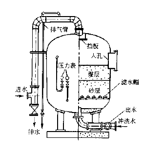 多介質(zhì)過(guò)濾器通過(guò)選擇密度不同的兩種或三種濾料,做到反沖洗后輕而粗的濾料在上層,細(xì)而重的濾料處于下層,形成上粗下細(xì)的較佳排列。濾料從粗到細(xì),截污能力漸增,因而實(shí)現(xiàn)了整層濾料截污能力與殘留雜質(zhì)除去難度的最佳匹配。在過(guò)濾時(shí),水中大部分雜質(zhì)備截留在無(wú)煙煤層及煤砂交界處,因而截污能力相比單介質(zhì)過(guò)濾器約增加1倍以上。這種濾床性能優(yōu)越,截污容量大,過(guò)濾周期長(zhǎng),出水水質(zhì)好,水頭損失增長(zhǎng)速度慢。