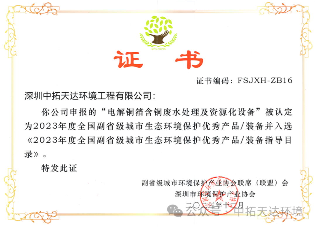 此次入選“2023年度全國副省級城市生態(tài)環(huán)境保護優(yōu)秀產(chǎn)品/裝備目錄”,是行業(yè)專家對中拓環(huán)境在電解銅箔行業(yè)含銅廢水處理及資源化工作的肯定和認可,充分體現(xiàn)了中拓環(huán)境在該領(lǐng)域具有較強的技術(shù)創(chuàng)新能力和項目實施能力。中拓環(huán)境作為工業(yè)水處理一站式解決方案服務(wù)商,將繼續(xù)緊密圍繞客戶的需求,針對重金屬廢水處理的難題將加大技術(shù)攻關(guān),為客戶提供“低耗、高效、智慧”的解決方案,打造更多、更好的產(chǎn)品/裝備。